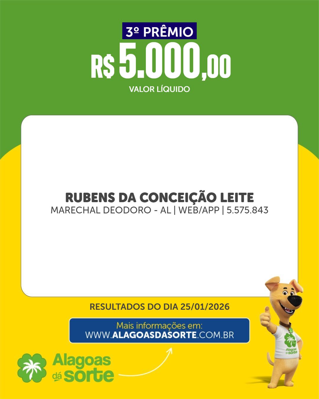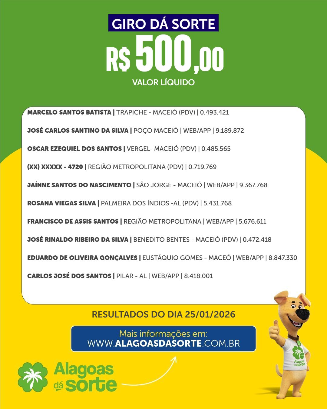 Confira quem foram os ganhadores do Alagoas Dá Sorte deste domingo, 25 de janeiro de 2026.