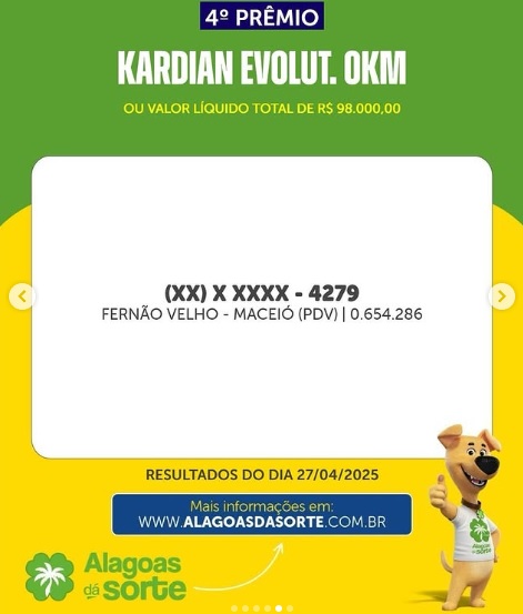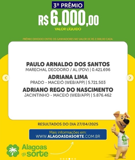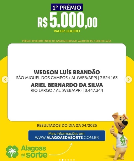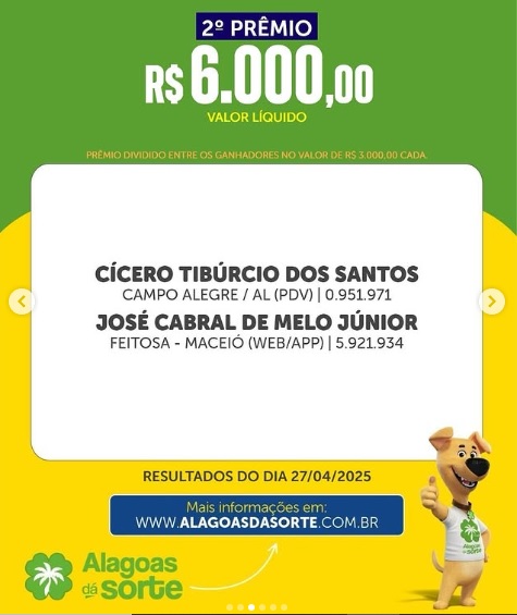 Confira, abaixo, os resultados do Alagoas dá Sorte deste domingo, dia 27 de abril de 2025.