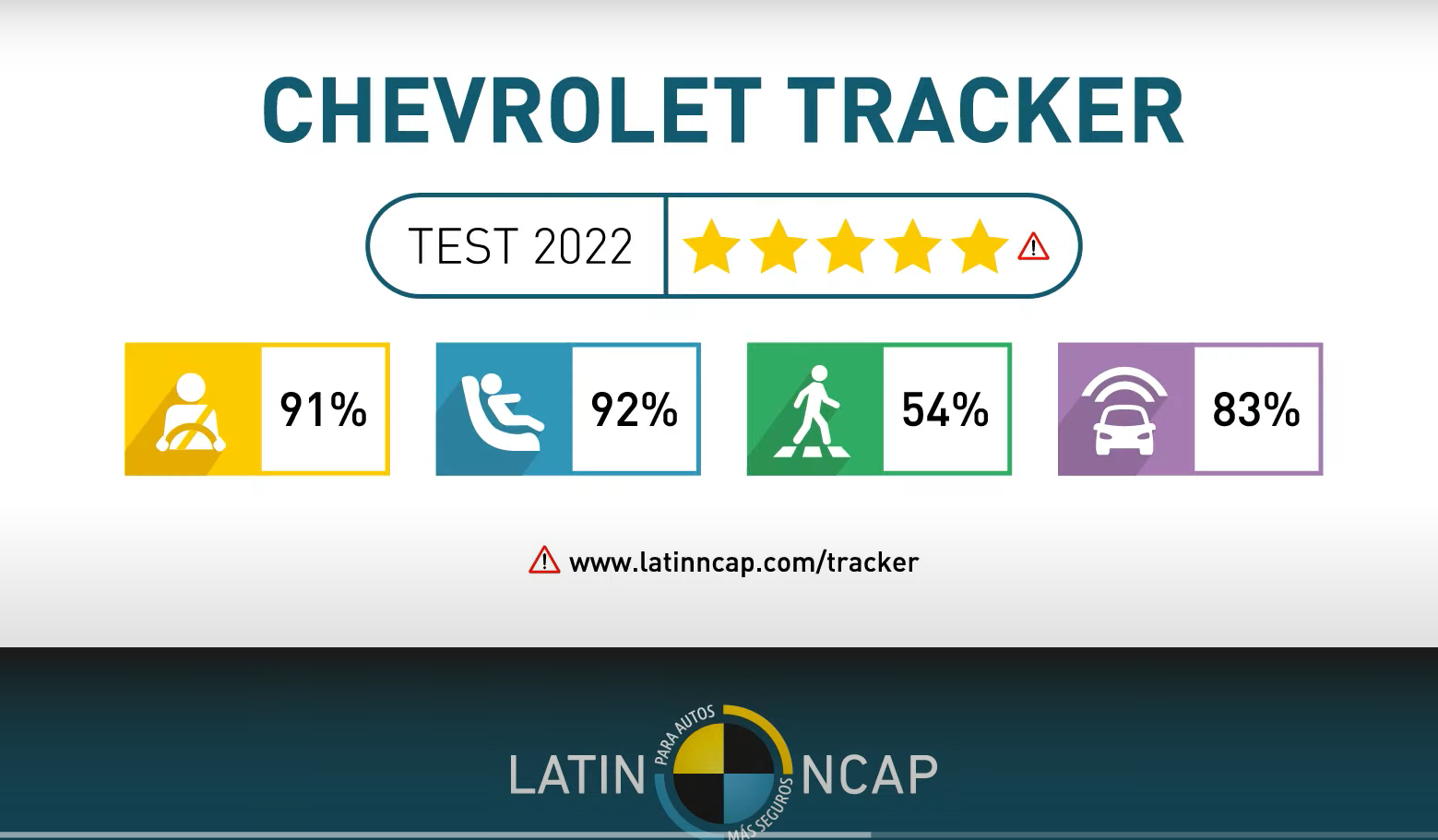 Em teste divulgado no youtube nesta quinta-feira, 8 de dezembro, o LatinNCap mostra que o Chevrolet Tracker com 6 airbags conquistou 5 estrelas no teste de colisão frontal e lateral.