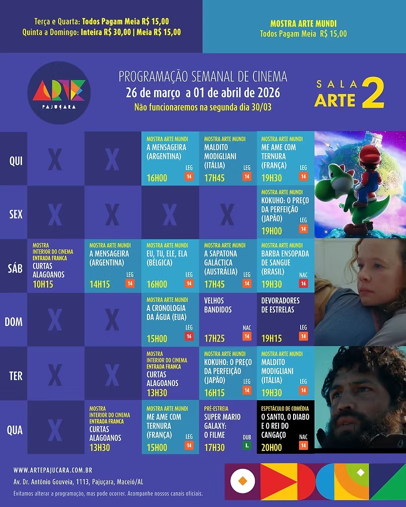 Para conferir a programação completa de todos os filmes em cartaz no Arapiraca Partage Shopping, Centerplex (Shopping Pátio Maceió), Cinesystem (Parque Shopping) e Kinoplex (Maceió Shopping): basta clicar aqui. Já para o Shopping da Vila, em Delmiro Gouveia, pode ser conferida aqui.