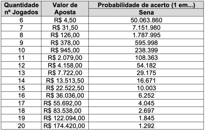 O quadro abaixo traz a probabilidade de acerto em relação à quantidade de números jogados e o valor da aposta:
