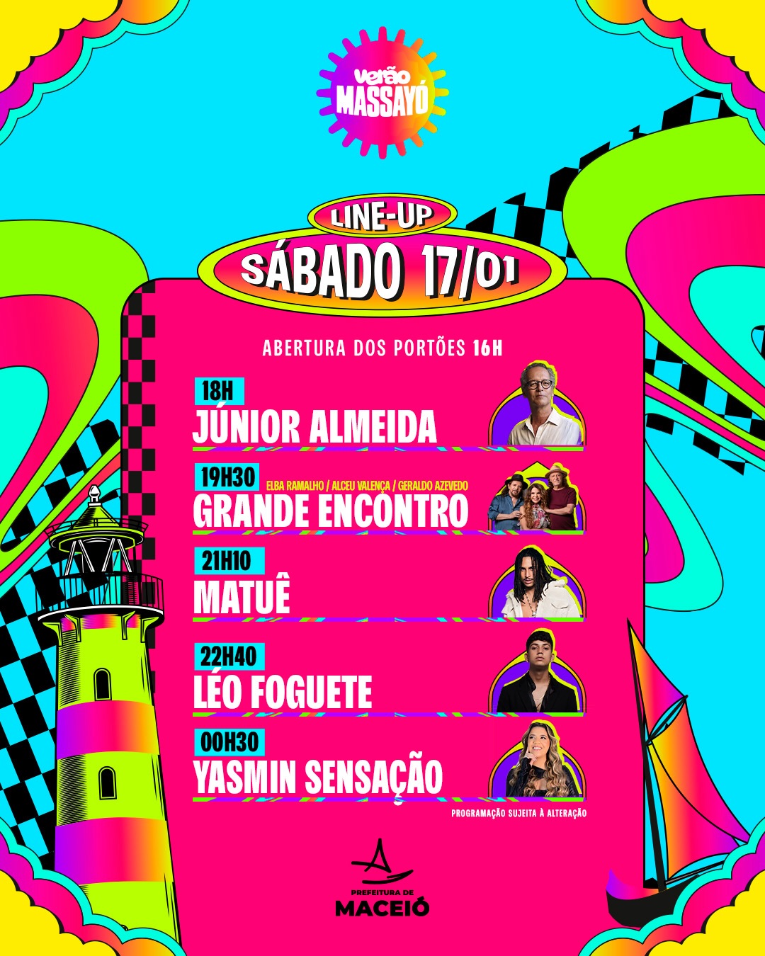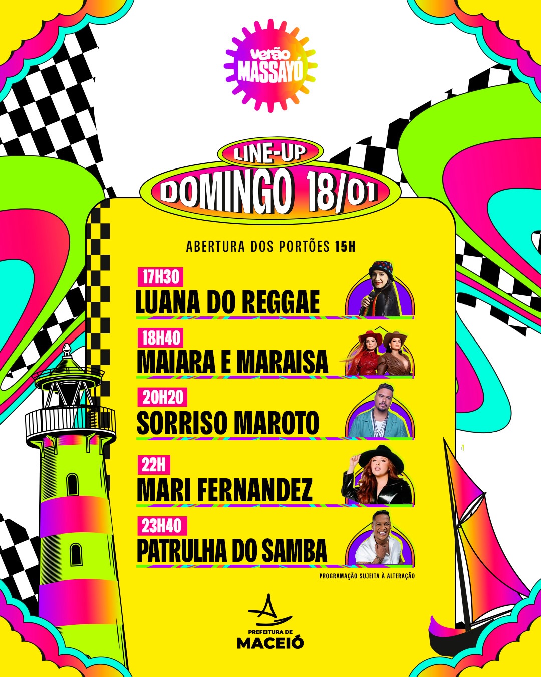 A Prefeitura de Maceió divulgou, nesta sexta-feira, 16, os horários dos shows que marcam o encerramento do Verão Massayó neste final de semana, no Estacionamento do Jaraguá, no litoral alagoano.