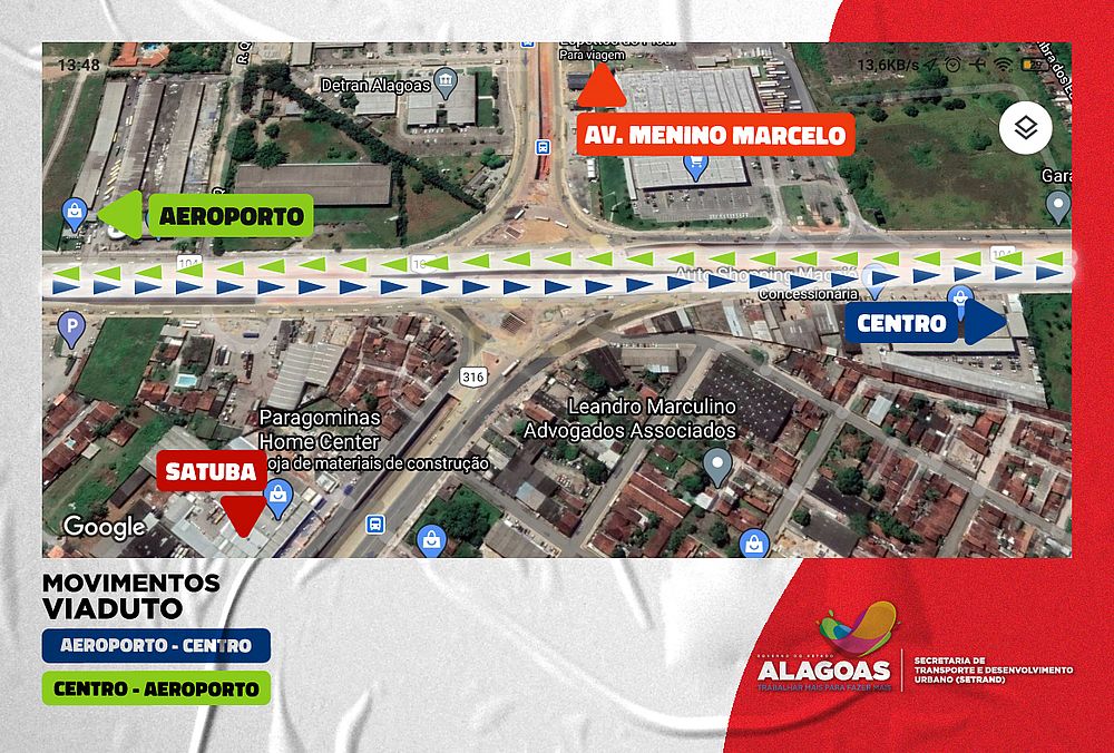 Não ocorrerão mudanças, entretanto, para os sentidos das alças laterais, que continuam a operar em nível nos sentidos: Centro/Av. Menino Marcelo, Av. Menino Marcelo/Aeroporto, Aeroporto/Satuba e Satuba/Centro. Da mesma forma, também em nível, todos os retornos serão feitos na rotatória, embaixo do viaduto.