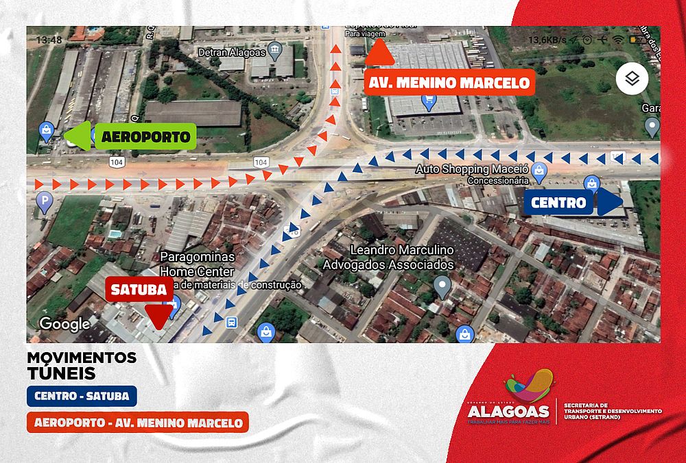 Junto com o viaduto, que se encarregará do fluxo de tráfego mais crítico, ligando a Avenida Durval de Góes Monteiro ao aeroporto – e vice-versa, os túneis aliviarão o congestionamento nos fluxos Centro/Satuba e Aeroporto/Avenida Menino Marcelo. (Confira nos mapas abaixo)