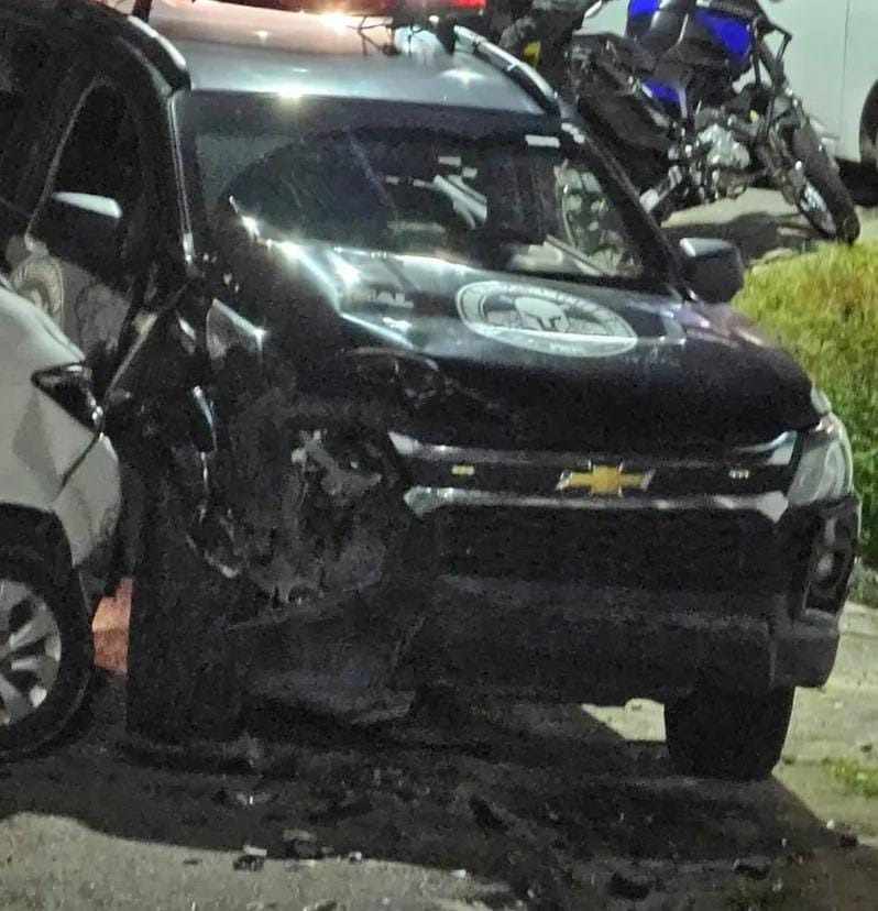 Durante a perseguição, a viatura acabou se chocando contra um carro Chevrolet Ônix que estava estacionado. Em imagens enviadas ao TNH1, é possível ver a parte dianteira do veículo danificada. Confira: