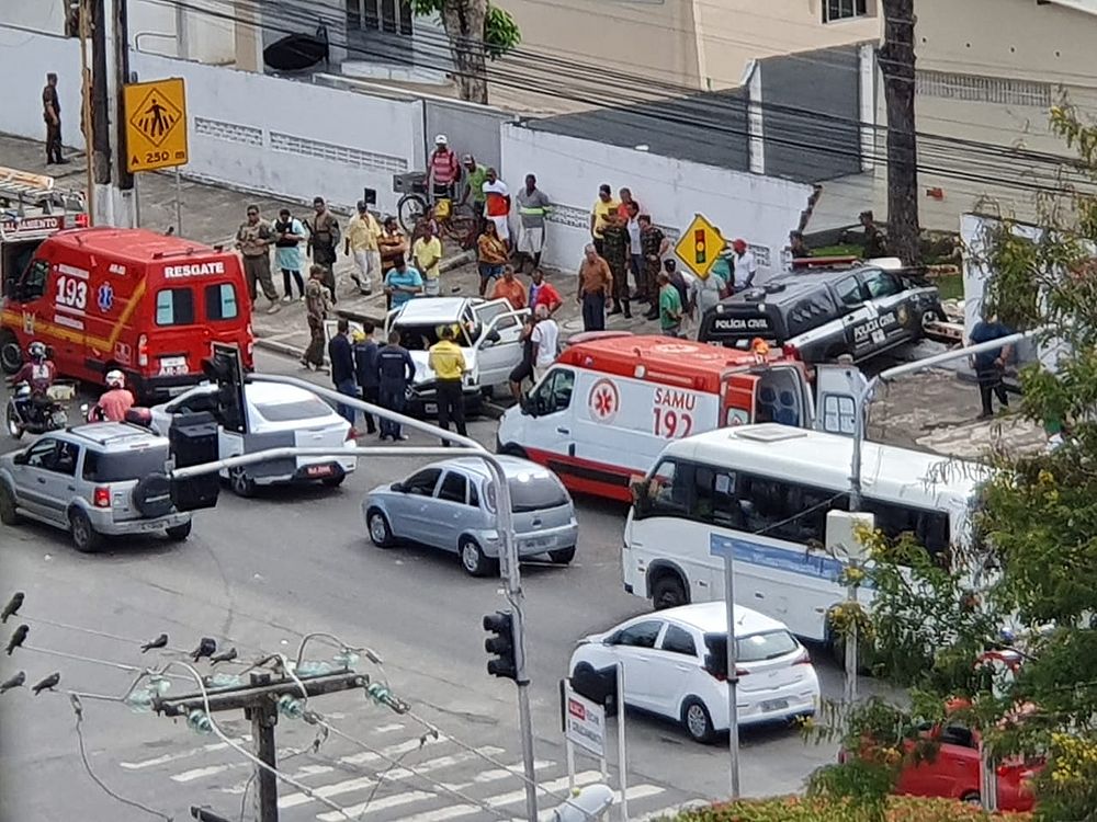 A viatura é uma picape da Delegacia Geral da PC, enquanto o outro carro é um Uno Mille branco. Dois policiais e dois passageiros do carro tiveram ferimentos, por isso, Corpo de Bombeiros, Samu e SMTT foram acionados.