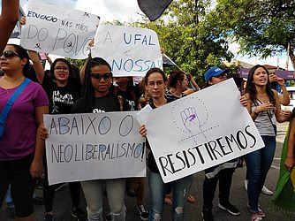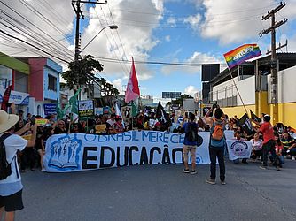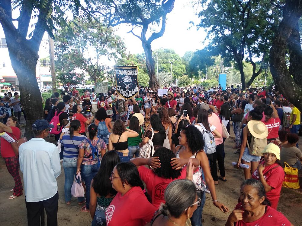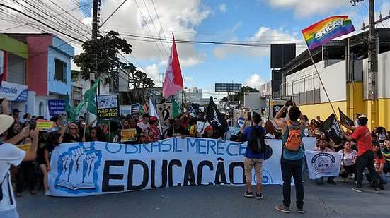 Em protesto ao contingenciamento de verbas na educação, decidido pelo governo Bolsonaro, estudantes, professores, entidades sindicais e simpatizantes pela causa se concentraram no início da tarde desta quinta-feira (30), na Praça Centenário, no bairro Farol. Às 14h, eles saíram em caminhada até o Centro da cidade.