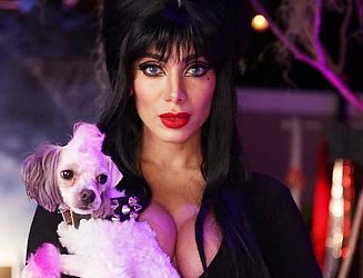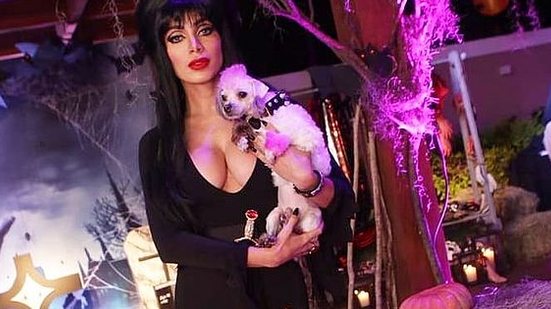 Fantasiada de Elvira, do filme cult “Elvira: A Rainha das Trevas”, ela surpreendeu ao usar também um modelito sexy, com os seios à mostra.