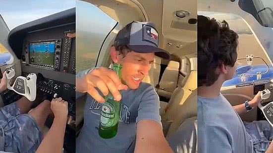 Nas imagens, Garon Maia está com uma cerveja long neck no meio das pernas, enquanto instrui seu filho a pilotar a aeronave Beechcraft Baron 58, a mesma envolvida no acidente deste fim de semana.