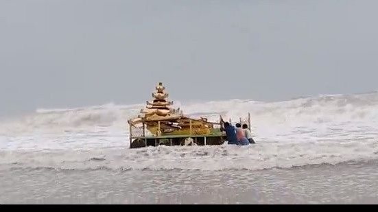 A gold-coloured chariot-like structure was spotted at Sunnapalli coast in Srikakulam district of Andhra Pradesh. The villagers brought the structure to the shore by tying ropes to it. The chariot is suspected to have strayed into AP coast under the impact of cyclone Asani. pic.twitter.com/T6zVMGLkOr