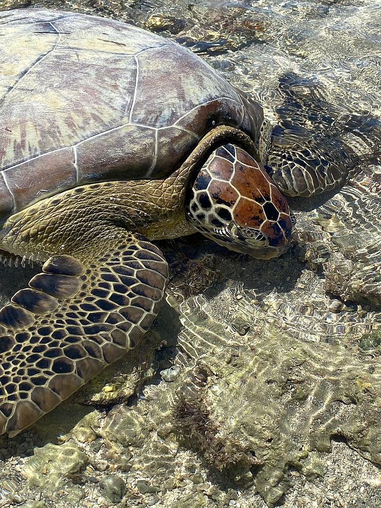 Banhistas que aproveitaram a maré baixa e foram até o local fizeram o registro da tartaruga nos corais. O Biota informou que vai ser anilhado para ser identificado caso volte a encalhar e, se estiver bem, será devolvido ao mar.