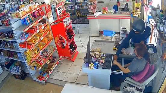 Nas imagens, também é possível perceber que o homem, aparentemente armado, obriga a atendente a retirar o dinheiro em espécie do caixa para entregá-lo. Segundos depois, ele coloca a quantia por baixo da blusa e sai do mercadinho. Uma mulher e um menor de idade estão como clientes no momento do assalto e nada sofrem.