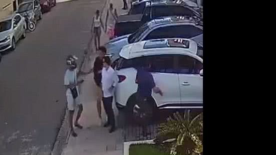 O vídeo acima mostra toda a dinâmica do roubo, da chegada até a saída do criminoso. Ele está em uma moto, para o veículo em um lado da rua e depois segue até o outro lado, onde aborda três homens no estacionamento de uma imobiliária. Também é possível perceber que o motociclista observa a conversa do trio ao passar pela rua e toma a decisão de estacionar o veículo para cometer o crime.