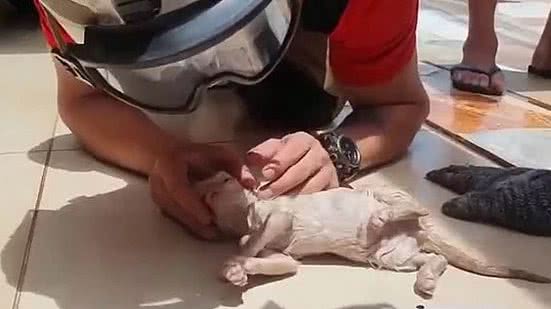 As imagens mostram o animal cercado pela equipe e um dos bombeiros fazendo massagem cardíaca nele. Depois, o militar faz a respiração boca a boca e é possível ver o filhote se movimentando aos poucos.