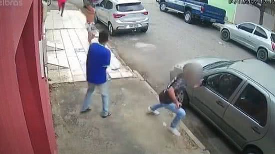 Uma câmera de segurança flagrou uma tentativa de homicídio, na tarde dessa sexta-feira, 4, na Rua Guedes Gondim, no Centro de Maceió. As imagens mostram dois jovens caminhando pela calçada, quando outros dois homens os confrontam correndo e um deles começa a efetuar disparos de arma de fogo contra o rapaz de camisa escura.
