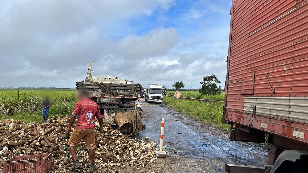 Um caminhão carregado de inhame tombou na BR-101, no município São Miguel dos Campos, na manhã desta quarta-feira (31).