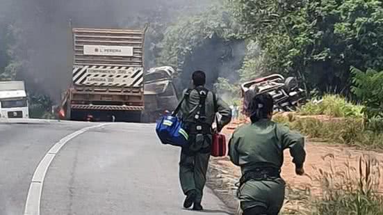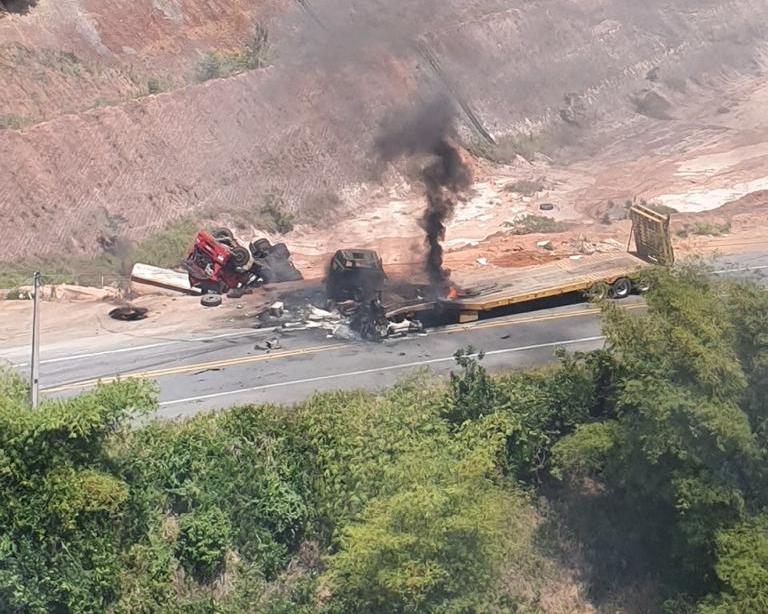 Um grave acidente entre duas carretas deixou dois feridos nesta quinta-feira (12), no quilômetro 113 da BR-101, entre os municípios de Pilar e São Miguel dos Campos, no interior de Alagoas. Segundo informações da Polícia Rodoviária Federal (PRF), os veículos bateram frontalmente e ficaram em chamas.