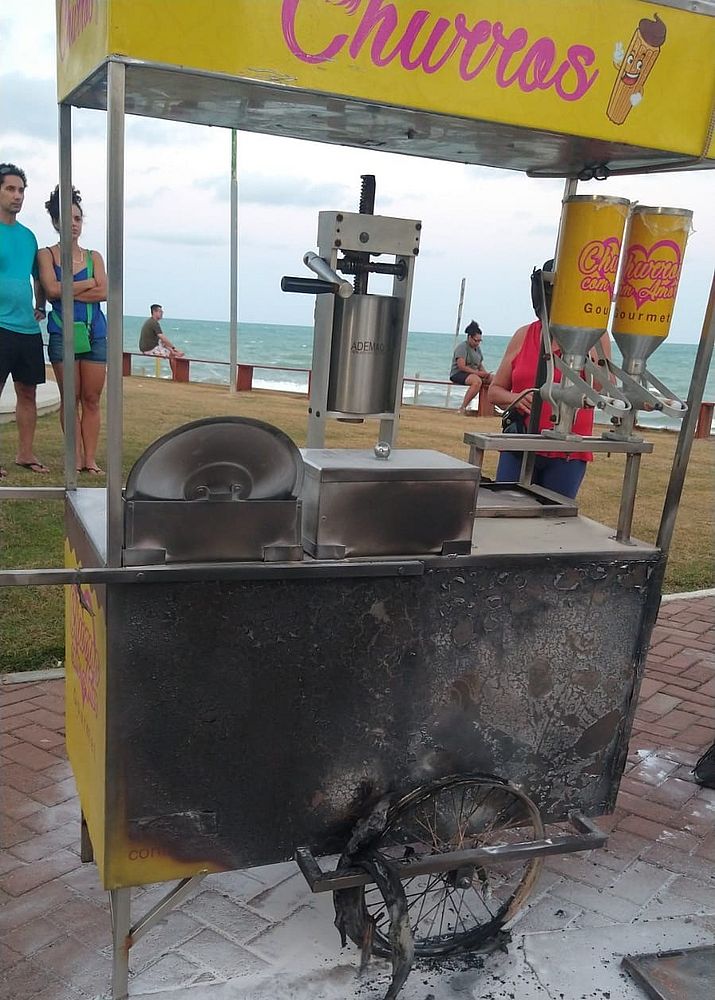 Um carrinho de churros pegou fogo e assustou quem transitava na orla do bairro da Jatiúca, em Maceió, na tarde desta quarta-feira (9).