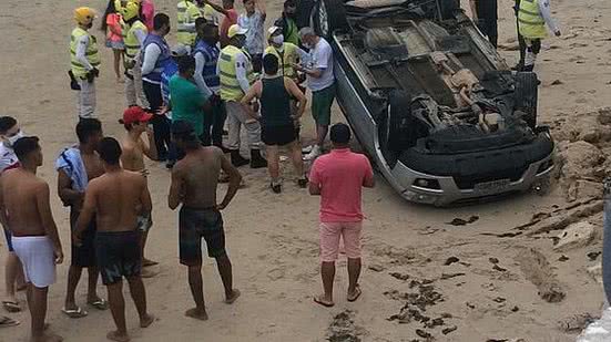 Um carro foi parar na areia da Praia de Ponta Verde, orla de Maceió, depois de sair da pista e capotar, no final da tarde desta terça-feira (25). A imagem do veículo capotado no meio da areia é de impressionar.