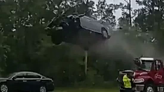A câmera corporal de um policial filmou o momento em que o veículo sobe a rampa de um guincho e voa mais de 30 metros adiante.