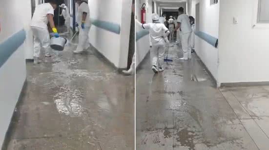 Imagens que circulam nas redes sociais mostram funcionários mobilizados com equipamentos para retirar o acumulado de água em um corredor da unidade hospitalar. Veja abaixo: