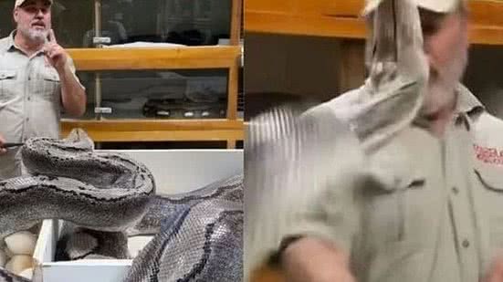 O apanhador de cobras profissional Jay Brewer quase foi picado por uma cobra Píton (Python) no rosto, na Califórnia, nos Estados Unidos. O fundador do Reptile Zoo, loja de animais que acabou se transformando em zoológico especializado em répteis, escapou graças a aba do seu boné.