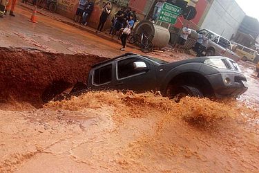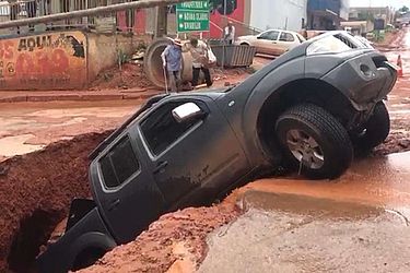 A forte chuva que caiu no Distrito Federal nesta terça-feira (23) causou estragos e levou um casal de idosos a viver momentos de tensão, em Vicente Pires. O asfalto de uma das ruas da cidade cedeu com a força da enxurrada, abrindo uma cratera, que "engoliu" uma caminhonete com as vítimas dentro. Imagens feitas por comerciantes da região mostram mais da metade do veículo dentro do buraco, e diversas pessoas em volta preocupadas, tentando ajudar.