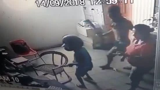 O crime aconteceu por volta das 13h. A imagem da câmera de segurança flagrou a investida. A criança usa um capacete para esconder o rosto, enquanto o outro tem o rosto coberto por uma camisa. O roubo dura menos de um minuto.