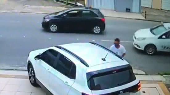 A câmera de segurança flagrou o momento em que o suspeito aproveita o movimento do trânsito enquanto a vítima está com o veículo parado na beira da pista, abre a porta do passageiro e invade o carro. A vítima é obrigada a dar a partida e sair com o criminoso no carro.