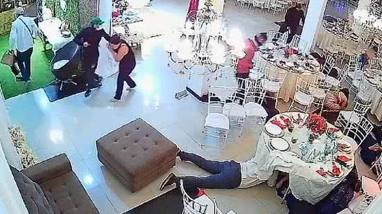 Vídeo da ação mostra que homens anunciaram o assalto quando os convidados começavam a se sentar após chegarem ao salão de festas. Todos se jogaram no chão e, alguns, tentaram se esconder sob as mesas.