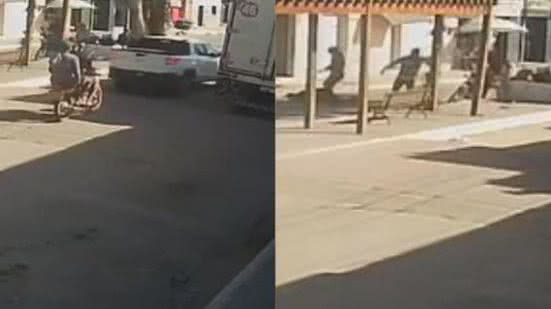 Em um primeiro momento, os dois ocupantes da moto encostaram perto de uma Fiat Strada, de cor branca. Os suspeitos então desceram e correram atirando na direção deles. O horário na câmera de segurança mostra que a ação aconteceu às 14h56.