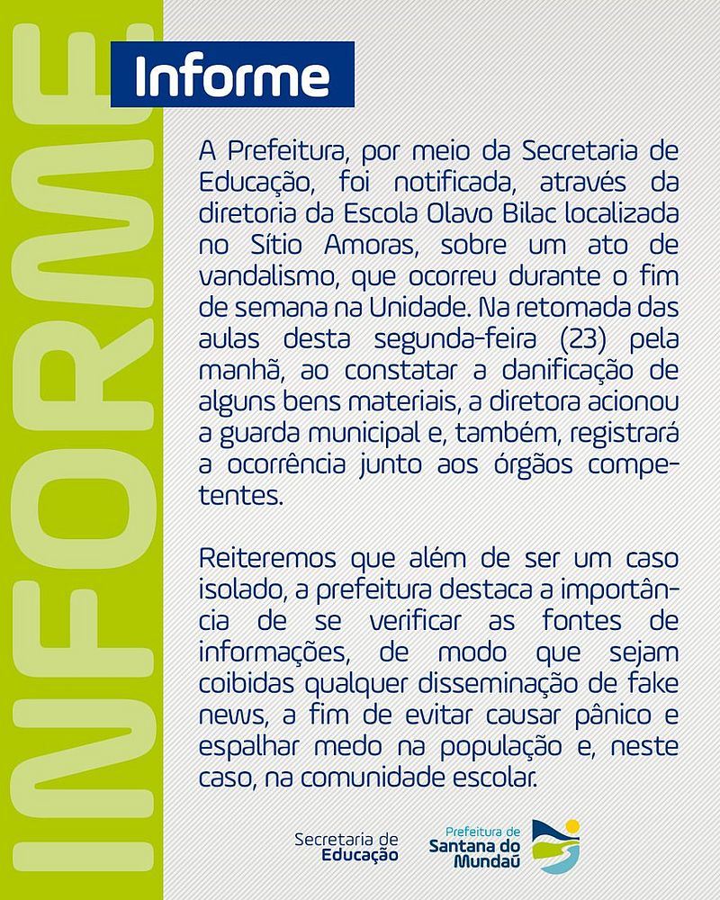 Ainda de acordo com a secretária, o segundo caso teria acontecido em uma escola municipal, onde salas ficaram destruídas e equipamentos foram danificados. A prefeitura municipal de Santana do Mundaú divulgou uma nota sobre o vandalismo na unidade de ensino. Veja: