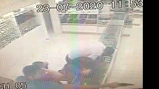 As imagens mostram um dos assaltantes segurando uma senhora e empunhando uma arma de fogo, enquanto um casal de clientes fica recuado próximo da bancada e duas funcionárias obedecem o outro assaltante e recolhem produtos da loja.