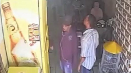 O vídeo mostra dois homens dentro do estabelecimento comercial às 9h57. Um estava vestido com um casaco de cor roxa e uma bermuda jeans, além de usar um boné na cabeça e um fone no ouvido. Já o outro trajava uma camisa de botão e também uma bermuda jeans.