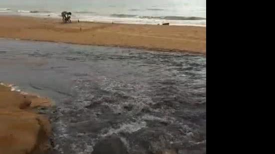 Nas imagens é possível ver que o líquido escuro e com mau cheiro jorra na areia e segue em direção ao mar.