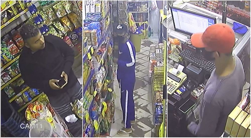 Imagens compartilhadas com a reportagem mostram a ação do trio. Um deles aparece em um primeiro momento com o rostos descoberto, porém antes de anunciar o assalto, coloca uma máscara para não ser reconhecido pela proprietária. Ele veste um casaco e uma calça de cor azul, além de usar um boné preto.