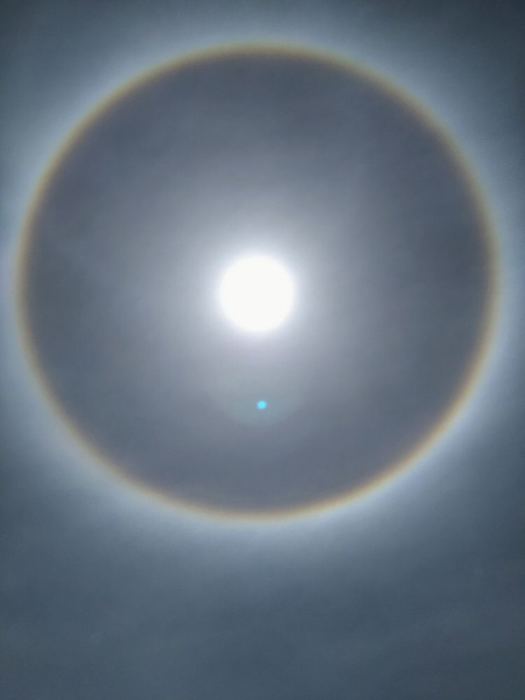 “O halo solar ocorre quando os raios de sol refletem em cristais de gelo que estão nas nuvens cirrus stratus (nuvens brancas e finas que cobrem a maior parte do céu)”, explicou. O anel de luz está justamente ligado à estrutura hexagonal desses cristais.