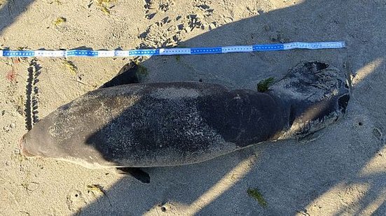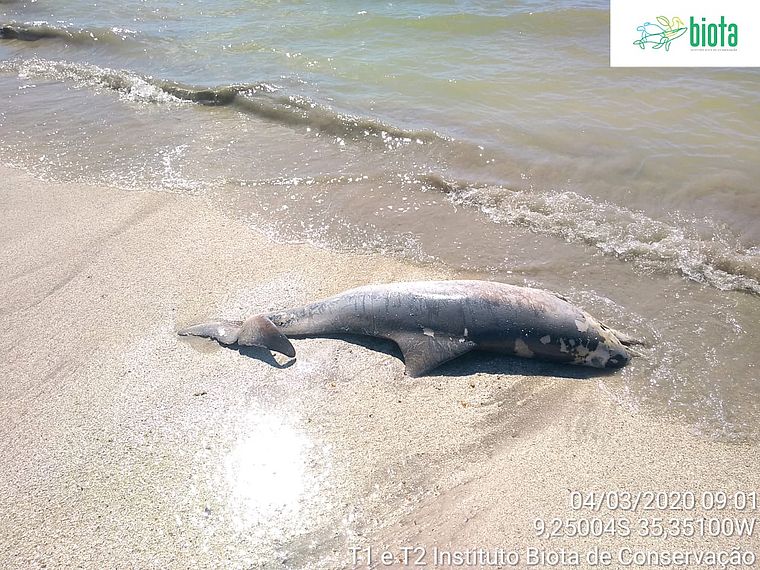 Um golfinho também foi encontrado morto nesta quarta-feira (4), no período da manhã, na praia de São Miguel dos Milagres. A equipe do Biota também esteve no local para registrar e recolher o animal, um boto-cinza adulto, de 1,86m de comprimento, da espécie Sotalia guianensis.