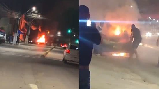 O veículo de modelo Ford Fiesta foi tomado pelas chamas nos primeiros minutos do domingo, mas as pessoas que estavam próximas não foram atingidas. Houve apenas dano material.