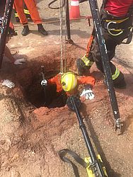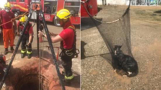 Uma militar usou uma corda para entrar no buraco e depois colocou o gato num puçá - rede usada para captura de animais - para ele ser erguido para fora do espaço.