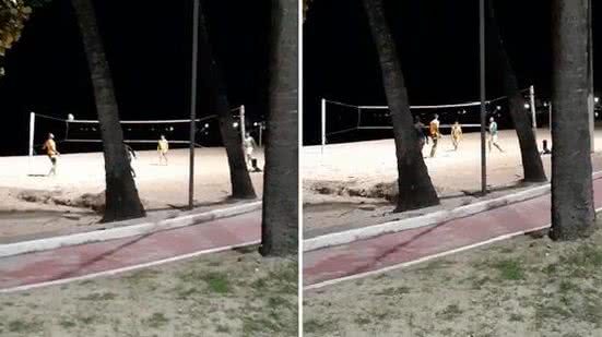 Um grupo foi flagrado jogando futevôlei na areia da Praia de Pajuçara, em Maceió, na noite dessa sexta-feira (03). A orla da capital está liberada após o governo do estado anunciar a entrada na fase laranja do isolamento social controlado, porém a prática esportiva no local não está sendo permitida.