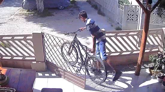 Imagens de uma câmera de segurança captaram o momento em que ele mexe no portão e se afasta do local. Então retorna alguns segundos depois e entra na residência, como se morasse no local. Na sequência, o suspeito aparece saindo da casa com uma bicicleta preta. Ele sobe no veículo e vai embora pedalando, deixando o portão aberto.