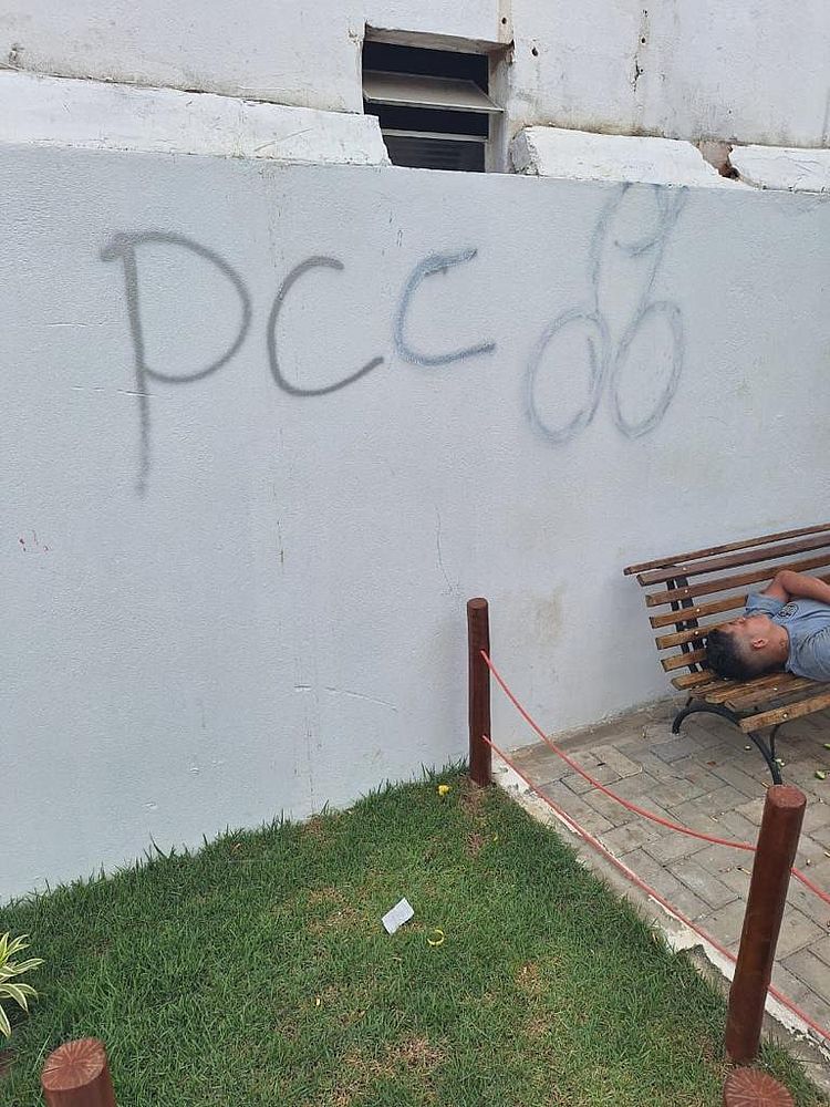 De acordo com a Polícia Militar (PM), uma viatura foi encaminhada à praça para atender uma ocorrência de vandalismo. Os policiais relatam que, quando chegaram ao local, o autor da pichação estava deitado, tirando um cochilo num banco.