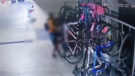 De acordo com os policias, uma equipe foi acionada após moradores denunciarem uma invasão em um edifício residencial, de onde foi levada uma bicicleta. As imagens mostram dois suspeitos forçando o portão de entrada do prédio e furtando a bicicleta do local.