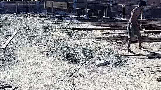 Um dos crimes foi registrado por uma câmera de segurança do condomínio e aconteceu durante a tarde do último dia 11. Nas imagens, é possível observar o suspeito sozinho num terreno, em área destinada ao armazenamento dos materiais de construção. Ele observa a grande quantidade de ferro no chão e depois pega alguns para levar. Assista:
