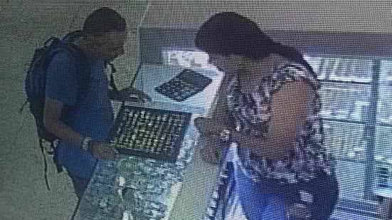 O vídeo mostra que o suspeito encostou no balcão do estabelecimento e pediu para olhar algumas joias. No momento em que a funcionária guardava o produto, o homem aproveitou a distração dela e se inclinou por cima da vitrine para pegar o ceular, que estava em uma mesa dentro da loja. Em seguida, ele colocou o aparelho no bolso esquerdo da calça.