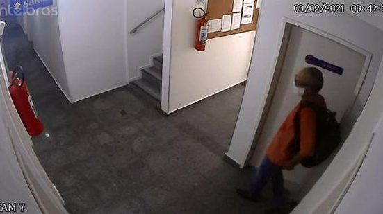 O vídeo mostra o momento em que o suspeito, vestido com camisa laranja e calça jeans, entra numa sala do estabelecimento com uma mochila. Instantes depois, ele deixa a sala com a bolsa aparentemente cheia. Ele ainda olha para os lados, para observar a chegada de alguma pessoa, e sai pelo corredor.