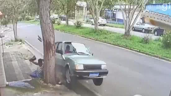 Nas imagens, é possível ver que a vítima percebe o carro vindo em alta velocidade e pula para a calçada. Praticamente no mesmo segundo, o veículo atinge a árvore.