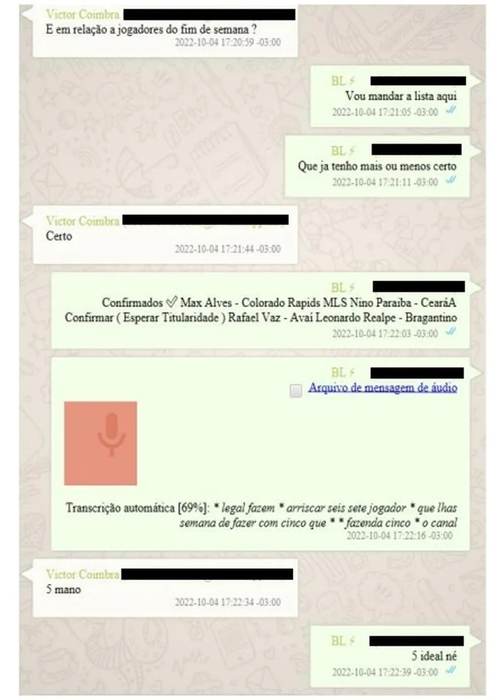Os nomes dos atletas aparecem em lista dos apostadores para combinação de jogos num fim de semana de outubro de 2022. Bruno Lopez diz que os nomes estão "mais ou menos certos".