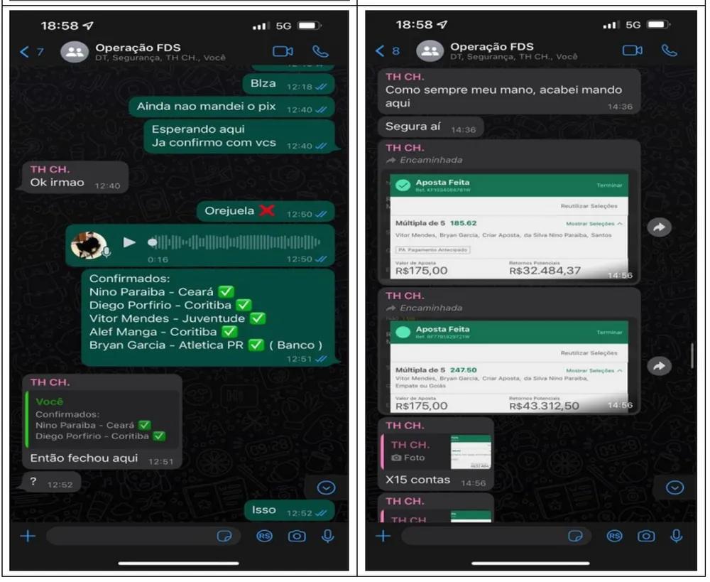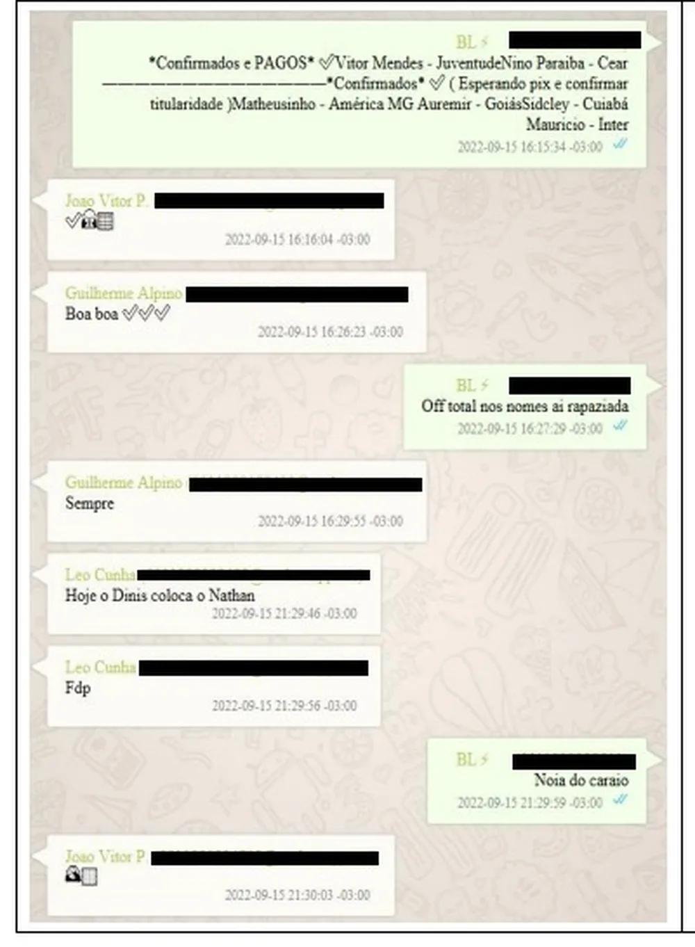 Os três aparecem como nomes "confirmados" em conversa entre os apostadores, em lista separada a de nomes que constam como "confirmados e pagos". "Off total nos nomes ai rapaziada", pede Bruno Lopez.